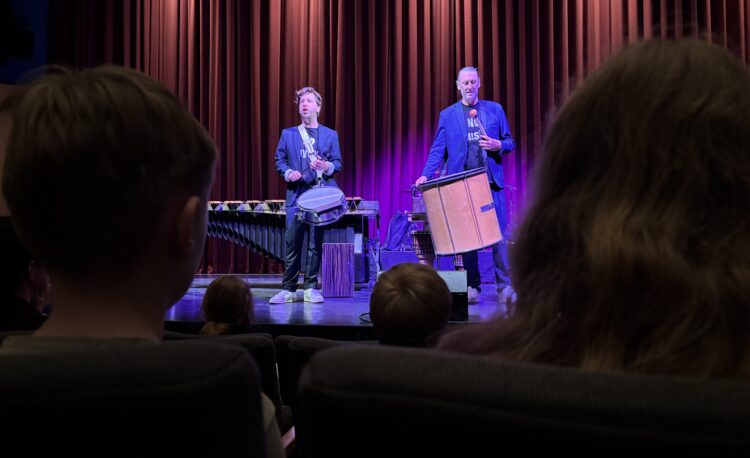 Mit einer beeindruckenden Vielfalt an Percussioninstrumenten und Schlagzeug-Setups brachten die Drum Twins die Bühne zum Beben. Sie spielten bekannte Stücke, experimentierten mit Rhythmen und bezogen das Publikum aktiv mit ein. Die Schülerinnen und Schüler waren begeistert von der Energie, der Kreativität und dem Humor der beiden Musiker.