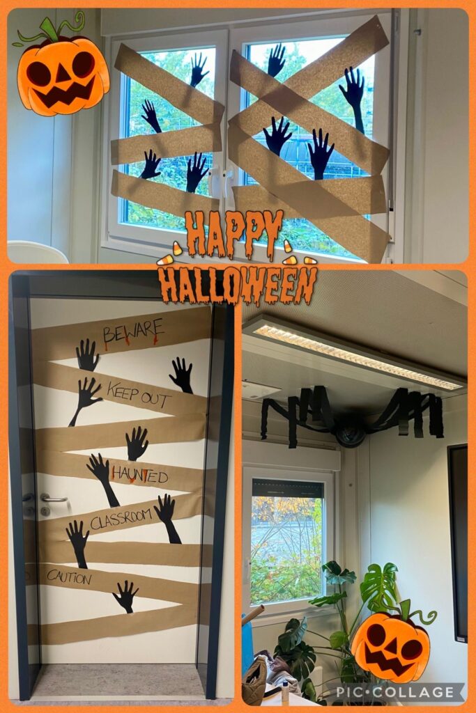 Am 31. Oktober ist die Halloweennacht, ein Anlass für einige Klassen, den Klassenraum zu dekorieren oder ein kleines Fest zu feiern. Im Klassenraum der 7a findet sich eine tolle Halloweendekoration, schon der Eingang zur Klasse ist dekoriert! Die Klasse 6d feiert ein kleines Fest mit einem kleinen Buffet voller leckerer Halloweenköstlichkeiten! Im Englischunterricht verschiedener Klassen wird das Thema besprochen! Woher kommt die Tradition? Wer feiert das Fest? Viele Fragen und gruselige Antworten werden dazu gefunden!